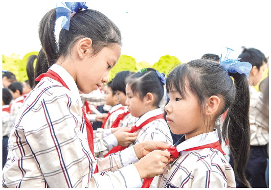 10月13日,南宁市滨湖路小学高年级的少先队员在入队仪式上为新入队的同学系红领巾。当日是中国少年先锋队建队73周年纪念日,广西南宁市滨湖路小学举行新队员入队仪式,497名小学生系上红领巾,光荣加入中国少年先锋队。