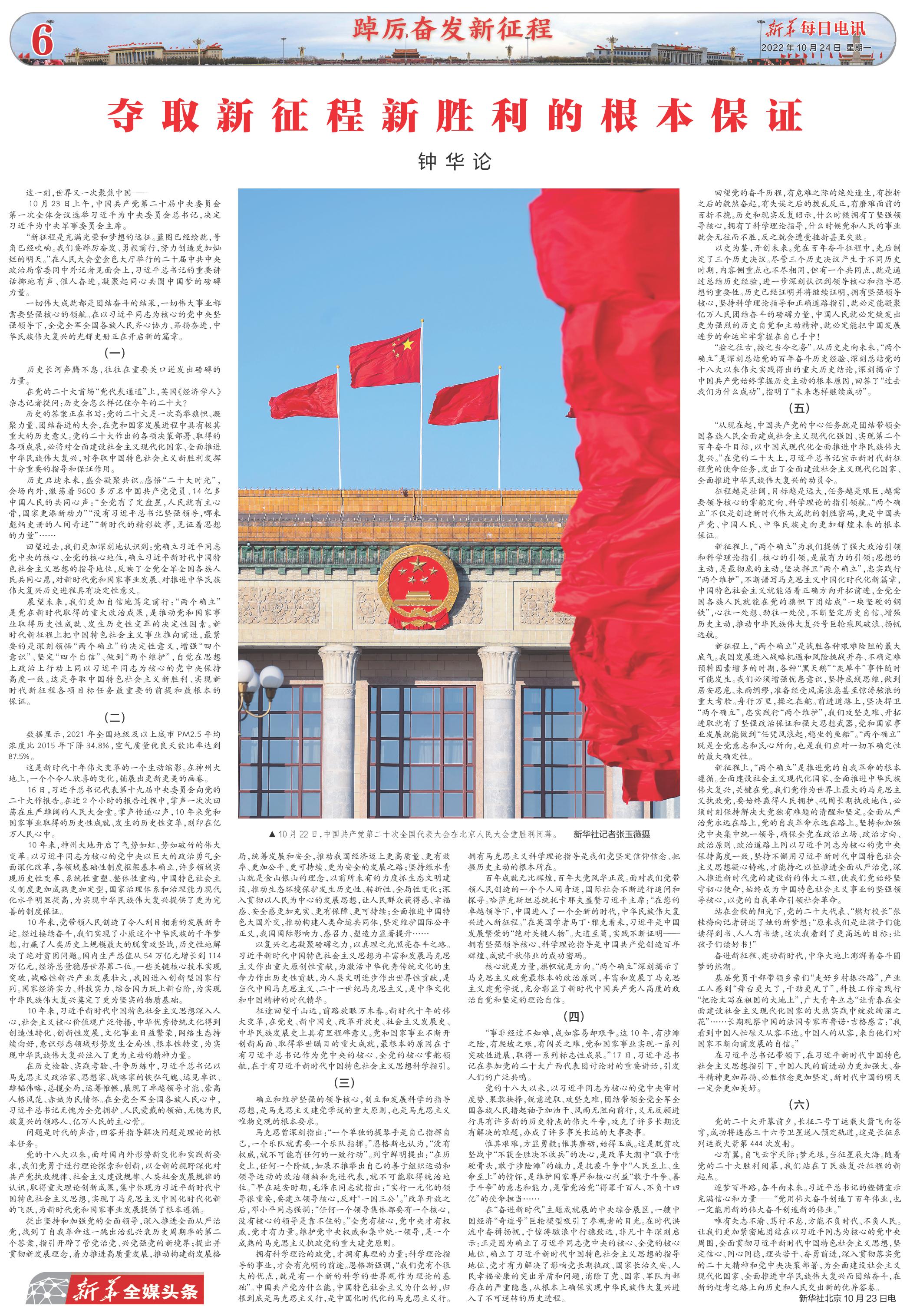 征程越是壮阔,目标越是远大,任务越是艰巨,越需要领导核心的掌舵定向、科学理论的指引领航。“两个确立”不仅是创造新时代伟大成就的制胜密码,更是中国共产党、中国人民、中华民族走向更加辉煌未来的根本保证。