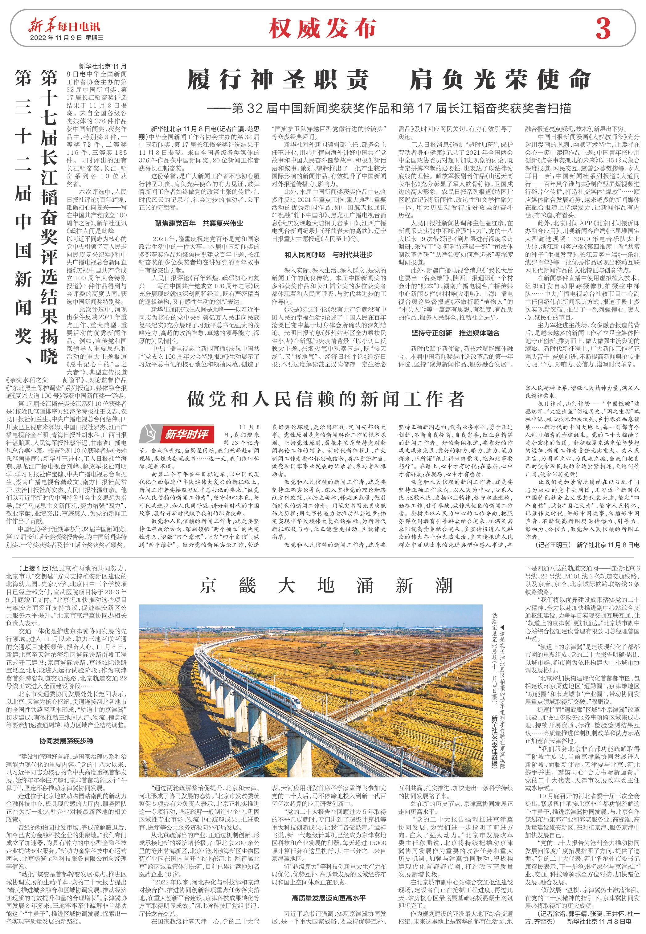 新华社北京11月8日电中华全国新闻工作者协会主办的第32届中国新闻奖、第17届长江韬奋奖评选结果于11月8日揭晓。来自全国各级各类媒体的376件作品获中国新闻奖,获奖作品中,特别奖3件,一等奖72件,二等奖116件,三等奖185件。同时评出的还有长江韬奋奖,长江、韬奋系列各10位获奖者。