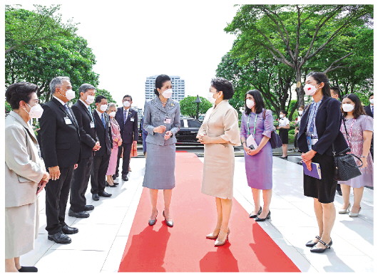 彭丽媛抵达时,娜拉蓬及泰国高教科研与创新部部长阿内、有关内阁部长夫人、甘拉雅尼音乐学院理事会主席比亚沙坤、院长初维等热情迎接。学院乐队奏响欢快的鼓乐,学生们挥动鲜花夹道欢迎。彭丽媛与娜拉蓬共同参观学院陈列室,认真听取学院发展历史和对外合作情况介绍,为学院与南京艺术学院建立和发展合作感到高兴。
