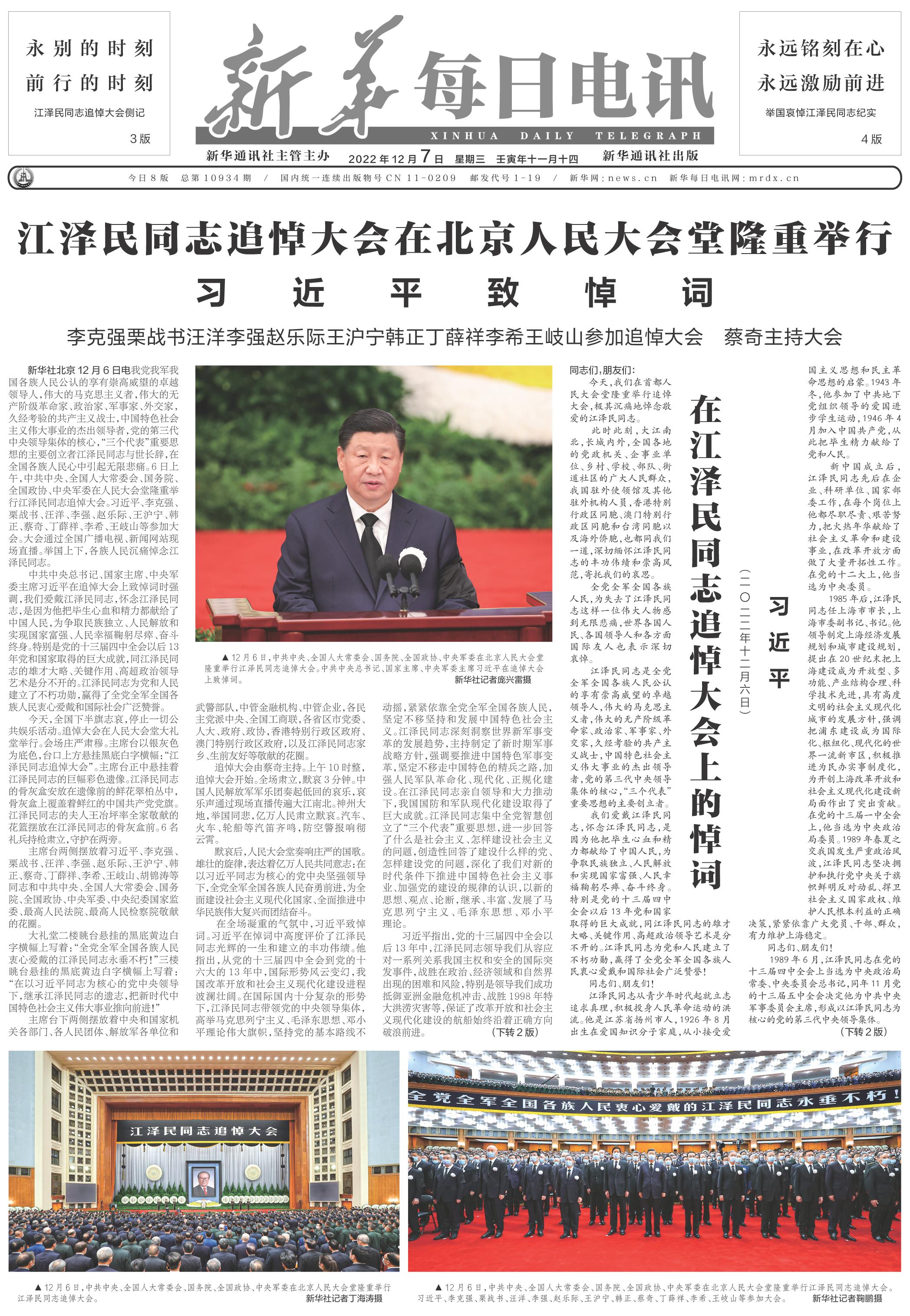 江泽民同志同我们永别了。他的英名、业绩、思想、风范将永载史册,世世代代铭刻在人民心中。全党全军全国各族人民要更加紧密地团结在党中央周围,踔厉奋发、勇毅前行,为全面建设社会主义现代化国家、全面推进中华民族伟大复兴而团结奋斗。