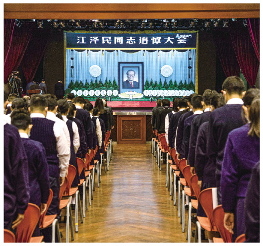 12月6日上午,中共中央、全国人大常委会、国务院、全国政协、中央军委在北京人民大会堂隆重举行江泽民同志追悼大会。举国上下,各族人民沉痛悼念江泽民同志。这是在澳门濠江中学,师生肃立默哀。
