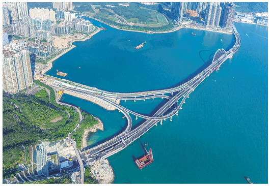 该桥采用“内地制造、香港安装”的建设模式,在江苏南通等地预制,经过海上长途运输运抵香港并完成安装。