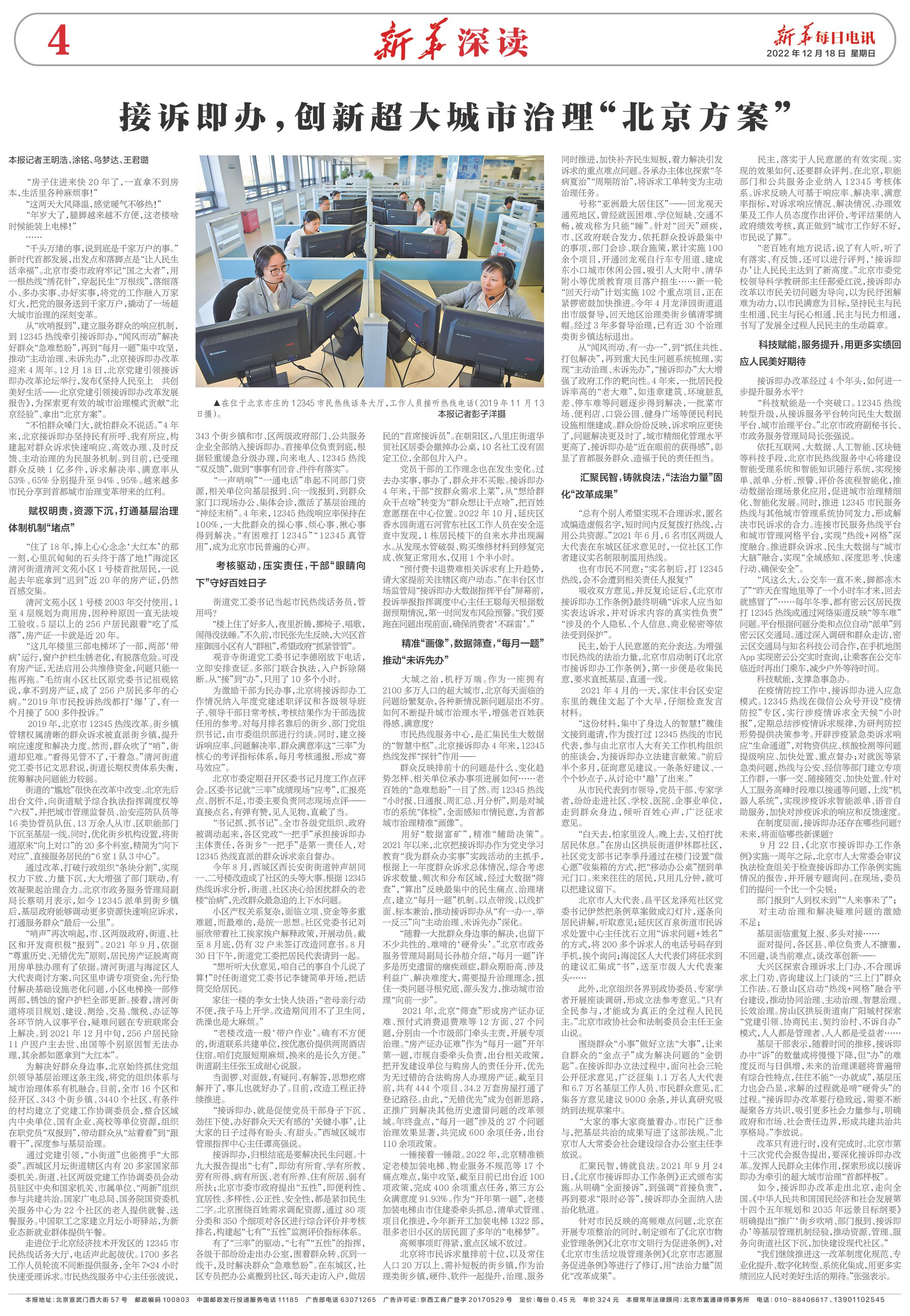“一声哨响”“一通电话”串起不同部门资源,相关单位向基层报到、向一线报到,到群众家门口现场办公、集体会诊,激活了基层治理的“神经末梢”。4年来,12345热线响应率保持在100%,一大批群众的操心事、烦心事、揪心事得到解决。“有困难打12345”“12345真管用”,成为北京市民普遍的心声。