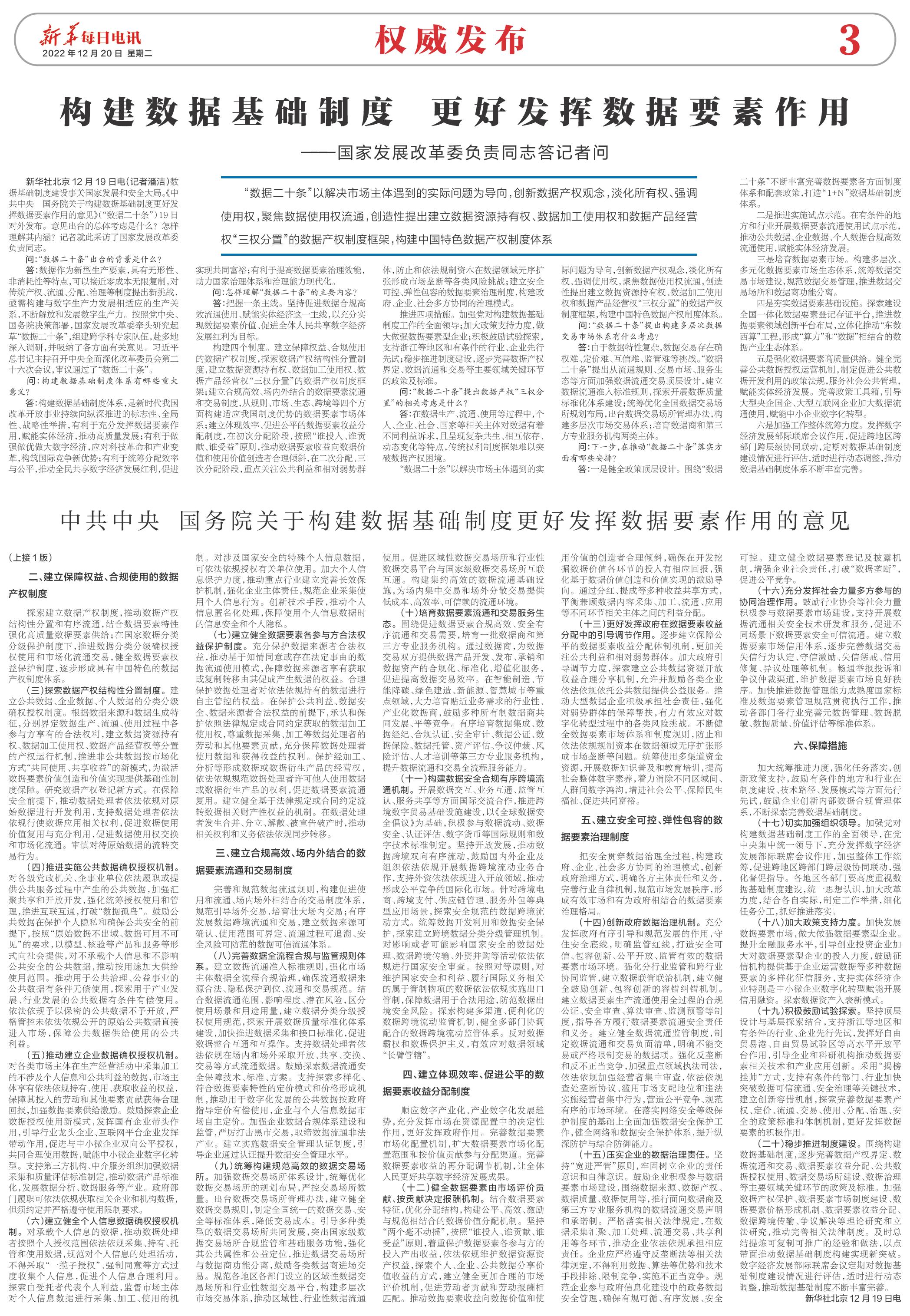 推进四项措施。加强党对构建数据基础制度工作的全面领导;加大政策支持力度,做大做强数据要素型企业;积极鼓励试验探索,支持浙江等地区和有条件的行业、企业先行先试;稳步推进制度建设,逐步完善数据产权界定、数据流通和交易等主要领域关键环节的政策及标准。
