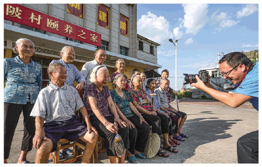 ▲在新余市分宜县杨桥镇建陂村颐养之家,摄影师为老人们拍摄全家福(9月14日摄)。