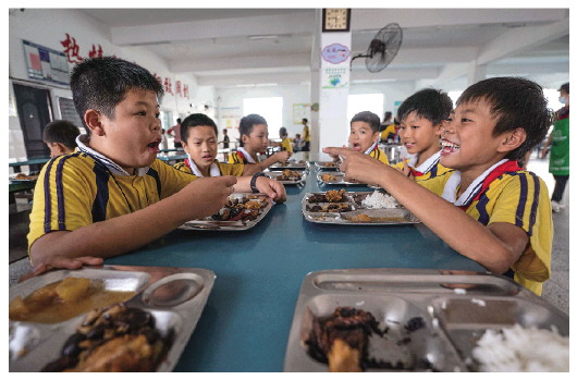 ▲新余市分宜县杨桥中心学校的寄宿小学生正在食堂里用餐(9月14日摄)。 新华社发(赵春亮摄)