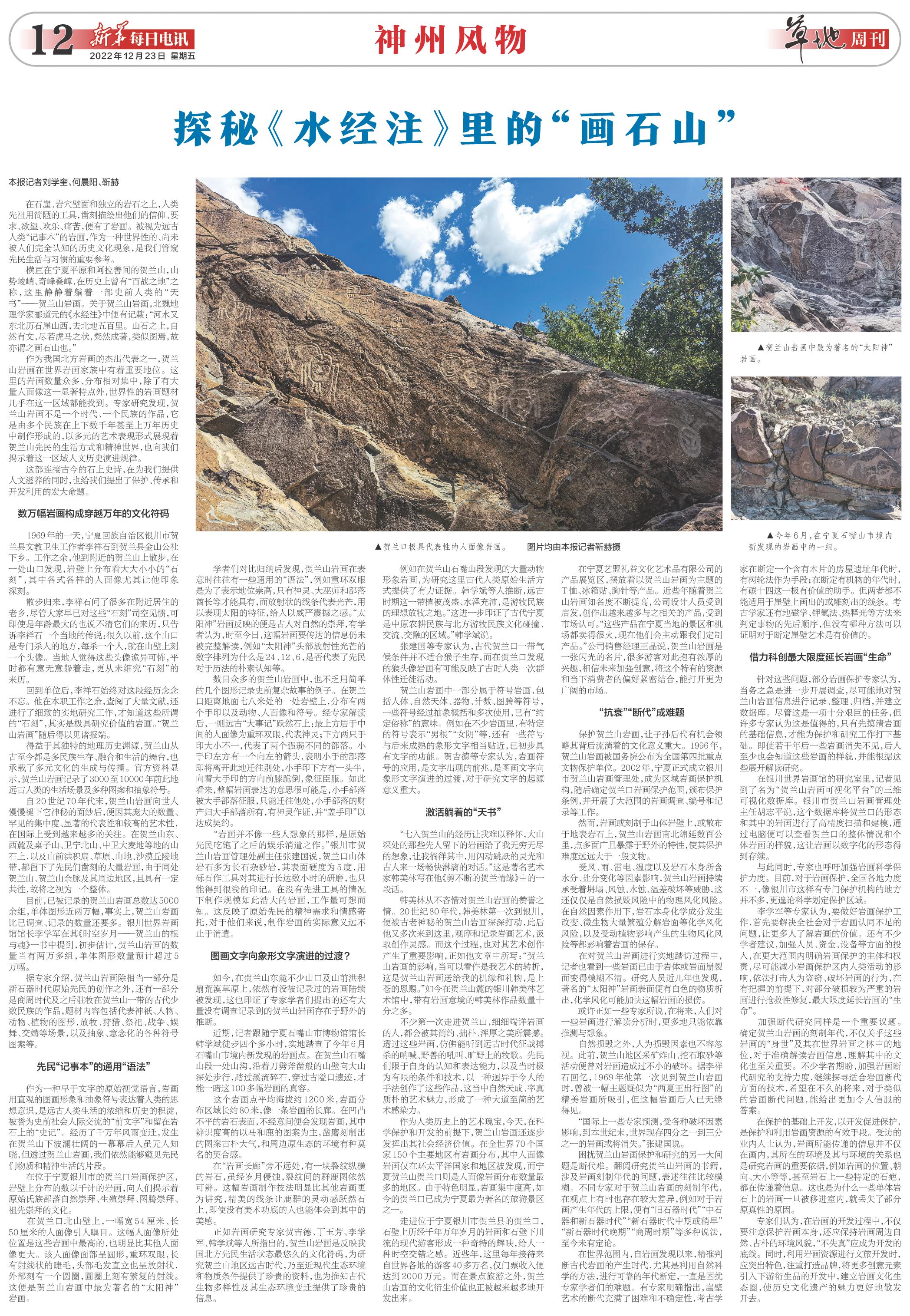 横亘在宁夏平原和阿拉善间的贺兰山,山势峻峭、奇峰叠嶂,在历史上曾有“百战之地”之称,这里静静着躺着一部史前人类的“天书”——贺兰山岩画。关于贺兰山岩画,北魏地理学家郦道元的《水经注》中便有记载:“河水又东北历石崖山西,去北地五百里。山石之上,自然有文,尽若虎马之状,粲然成著,类似图焉,故亦谓之画石山也。”