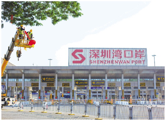 1月6日,工作人员在深圳湾口岸悬挂灯笼。