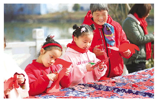 ▲1月19日,在浙江省湖州市德清县洛舍镇三家村,孩子们在当地举行的文化迎新春活动上制作生肖“兔”剪纸作品。