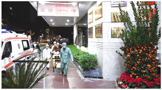 除夕夜,广东省中医院大德路总院急诊科的医护人员用救护车运送患者。
