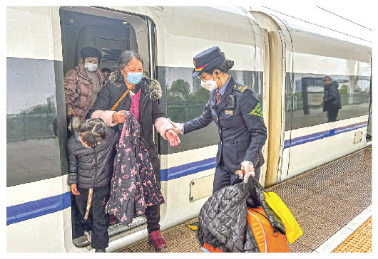 G1584次车到站后,列车长曾娟帮旅客将行李提下车(2月11日摄)。元宵节后,大批旅客返工回校,中国铁路南昌局集团有限公司南昌客运段积极做好服务工作,为旅客及时提供必要帮助。      (宋媚燕摄)