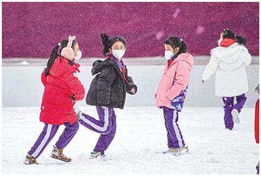 二月十三日,在西宁市城西区文汇小学,学生在雪中玩耍。当日,青海省西宁市的小学生迎来开学首日,孩子们在降雪中开启新学期。  新华社记者张龙摄