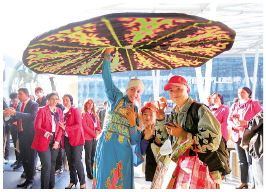 ▲1月20日,在埃及开罗国际机场,表演埃及传统舞蹈大裙舞的演员与中国游客合影。当日,在中国传统节日春节来临之际,埃及再度迎来中国旅行团。