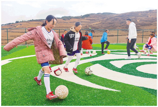 瓦吾小学的女足队员们在“玫瑰梦想球场”上训练(2023年3月3日摄)。四川省凉山州昭觉县瓦吾小学坐落于海拔约2700米的大凉山上,校长曲比史古2018年组建女足球队,希望让大山里的女孩子收获快乐,也获得更多人生可能性。过去几年,孩子们都是在一片泥地球场上训练,经常受伤。得知情况后,中国足协、支付宝以及女足国脚们决定一起为这支校园女足队捐赠一座足球场。2022年底,全国第二座中国女足主题球场——“玫瑰梦想球场”在大凉山上落成。
