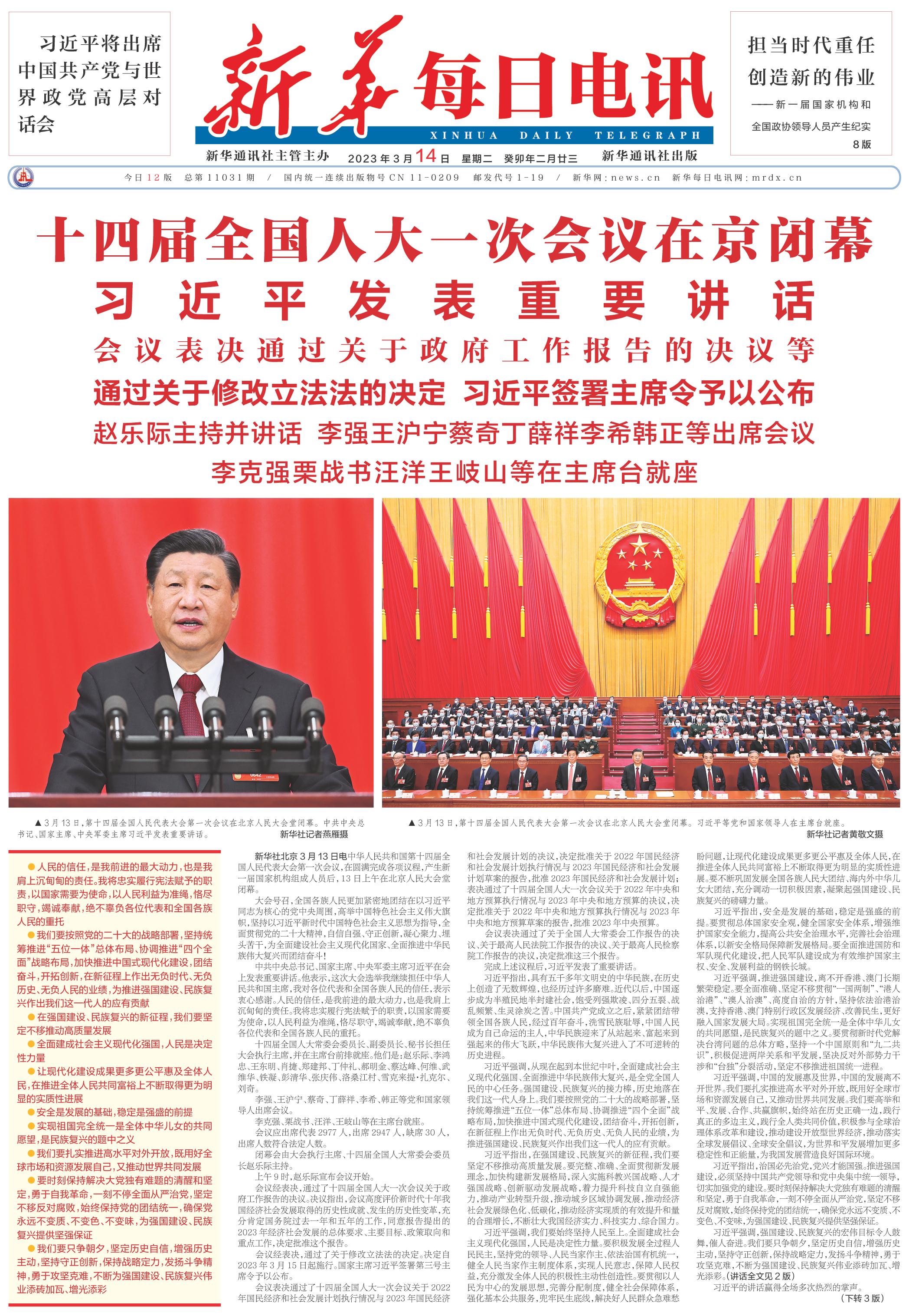 3月13日,第十四届全国人民代表大会第一次会议在北京人民大会堂闭幕。习近平等党和国家领导人在主席台就座。 新华社记者黄敬文摄 |