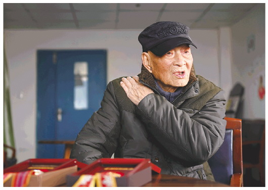 罗锦文老人在浙江省平湖市一家老年康复护理院接受记者采访,摸着右侧肩膀里子弹的位置(3月2日摄)。