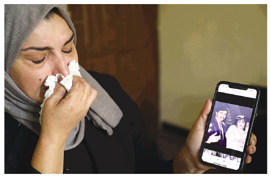 2月14日,在伊拉克北部萨拉赫丁省祖卢耶镇,松杜丝·拉米展示她和丈夫阿米尔的合影。 新华社发