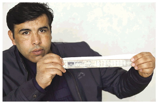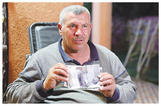 2月17日,在伊拉克北部萨拉赫丁省祖卢耶镇,阿拉·卡里姆·艾哈迈德展示他在被关押期间所戴的印有个人照片和信息的身份识别手环。 新华社发
