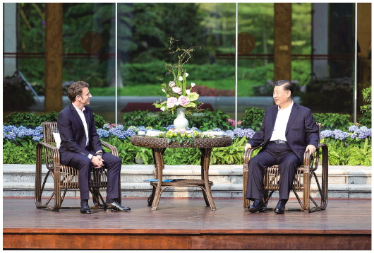 习近平指出,这两天,我们在北京和广州进行了深入、高质量交流,增进了了解和互信,为今后中法两国在双边和国际层面的合作明确了方向。很高兴我们在中法、中欧关系以及很多国际和地区问题上有很多相同或相似看法,这体现了中法关系的高水平和战略性。我愿同你继续保持密切战略沟通,推动中法全面战略伙伴关系提升至新高度。