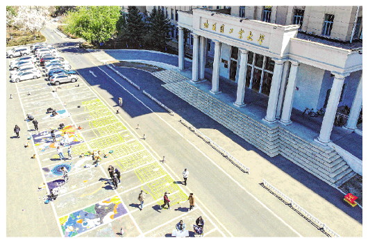 ▲4月22日,在哈尔滨工业大学校园,学生在进行航天主题的大地彩绘。在中国航天日即将到来之际,哈工大以“格物致知