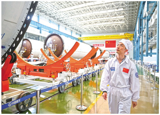 在航天科技集团一院天津火箭公司总装测试车间,骆鑫生在观察火箭某部件(4月19日摄)。 |