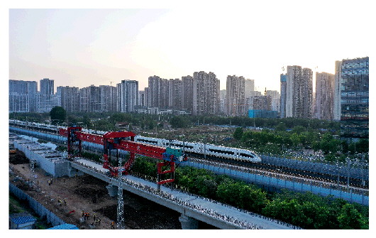 5月7日,在济郑高铁山东段站前I标,工作人员完成箱梁架设,至此济郑高铁山东段全面转入铺轨阶段。 新华社记者郭绪雷摄