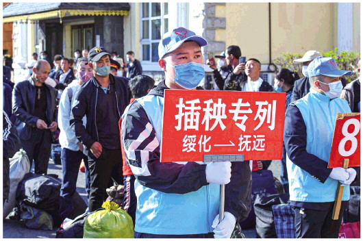在绥化火车站站前广场,志愿人员组织乘客候车。5月6日,K5151次列车从黑龙江绥化站驶出,400余名“插秧客”乘坐专列赴三江平原进行春耕生产。自哈尔滨铁路部门2000年首次开行“插秧专列”以来,已连续24年累计服务务农旅客超180万人次。  新华社记者王松摄