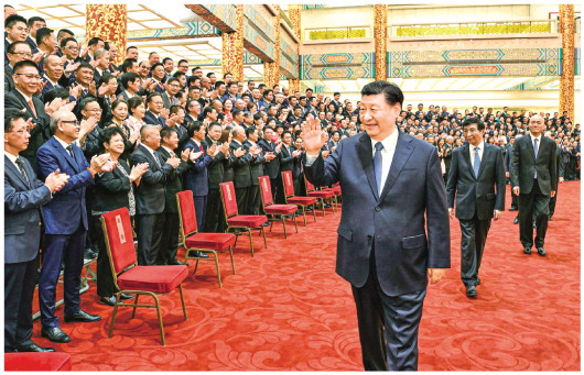 5月8日,党和国家领导人习近平、王沪宁、蔡奇等在北京人民大会堂会见第十届世界华侨华人社团联谊大会代表。 新华社记者李学仁摄