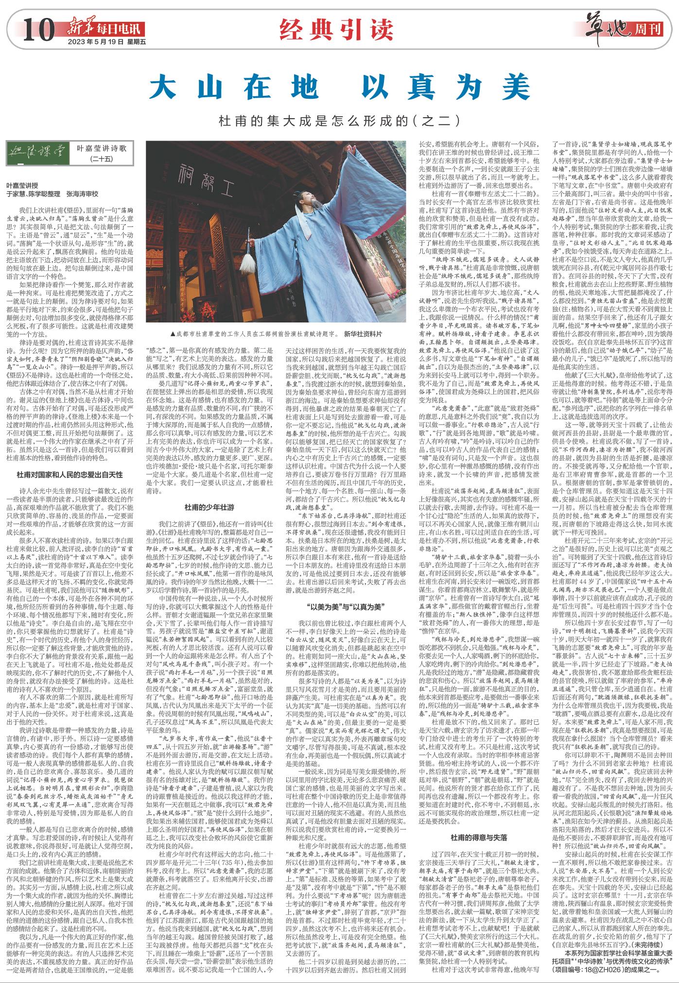 很多写诗的人都是“以美为美”,以为诗里只写风花雪月才是美的,而且要用美丽的辞藻产生美。可杜甫实在是“以真为美”。我认为其实“真”是一切美的基础。当然可以有不同类型的美,可以是“白云从空”的美,可以是“大山在地”的美,但最主要的一定是要“真”。儒家说“充实而有光辉之谓大”,伟大的作者一定以真实为美,外表再雕章琢句咬文嚼字,尽管写得很美,可是不真诚,根本没有生命,再美丽也是一个假玩偶,所以真诚才是美的基础。