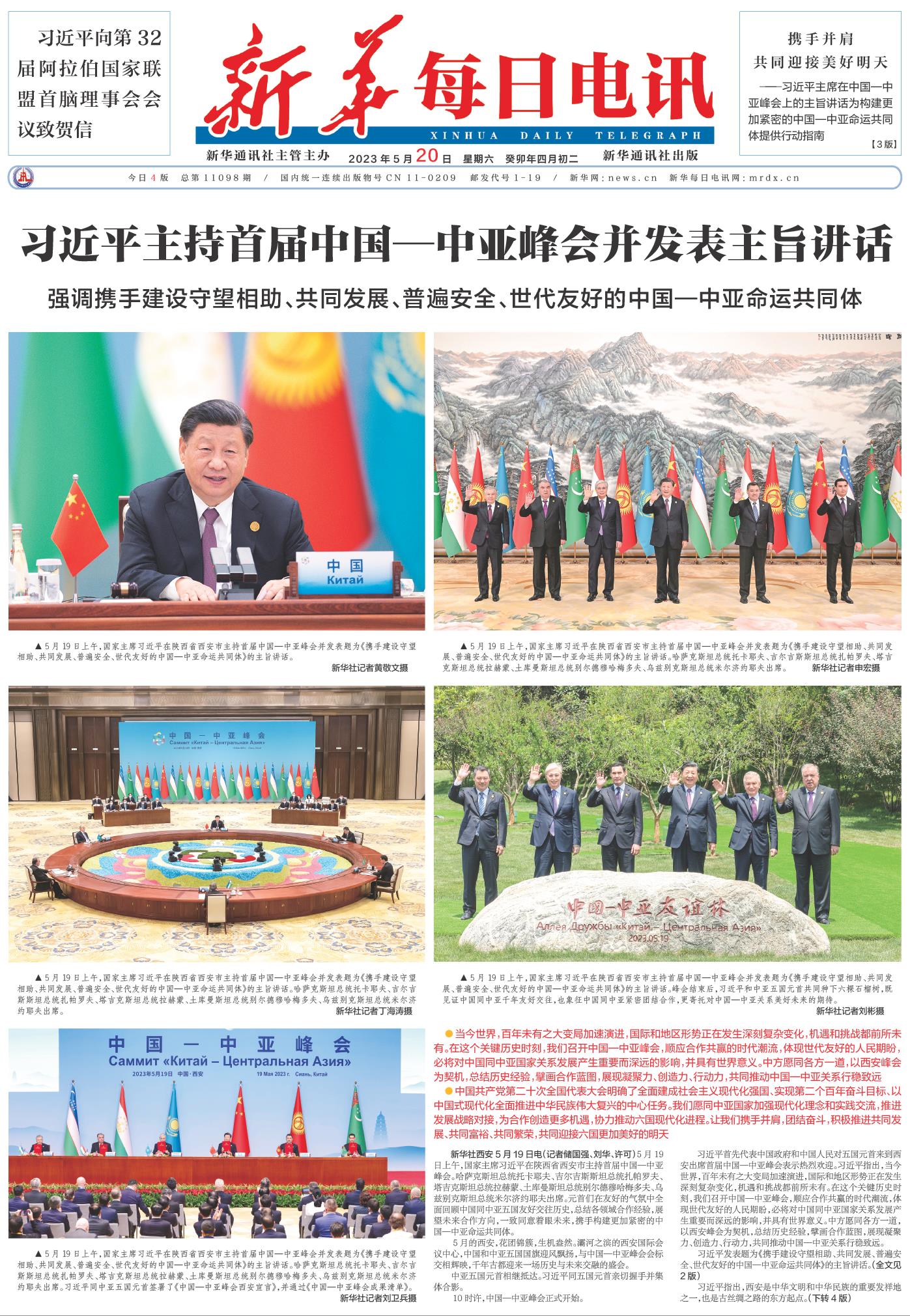 习近平发表题为《携手建设守望相助、共同发展、普遍安全、世代友好的中国—中亚命运共同体》的主旨讲话。(全文见2版)