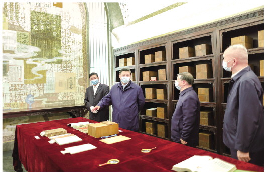 6月2日,中共中央总书记、国家主席、中央军委主席习近平在北京出席文化传承发展座谈会并发表重要讲话。这是座谈会前,习近平1日下午在中国国家版本馆考察时,在兰台洞库了解馆藏精品版本保存情况。