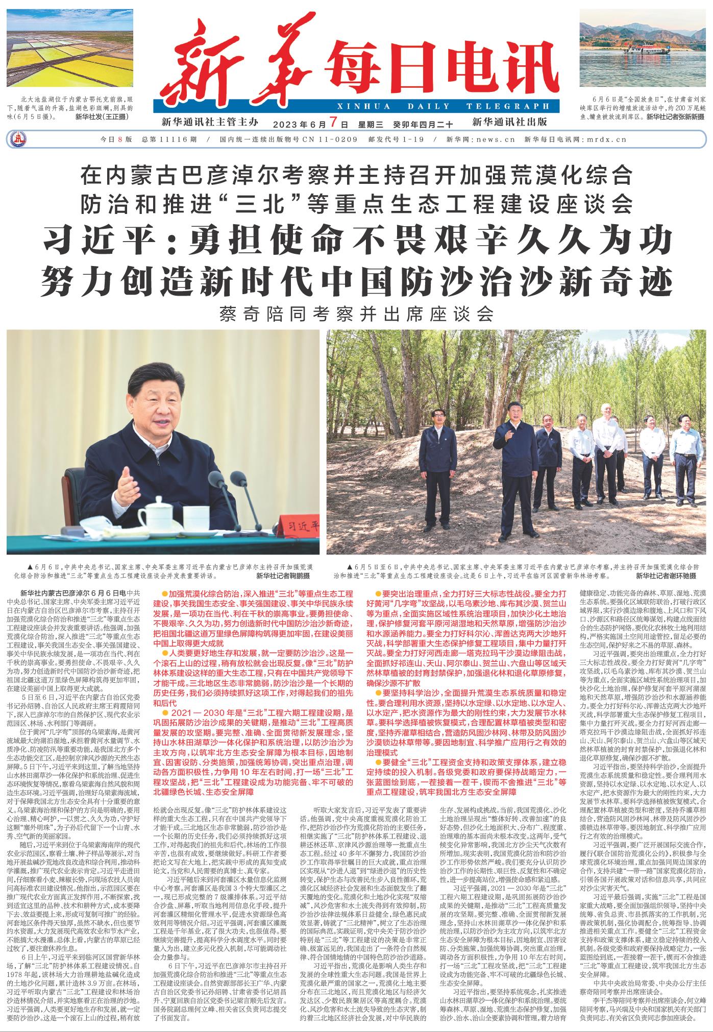 新华社内蒙古巴彦淖尔6月6日电中共中央总书记、国家主席、中央军委主席习近平近日在内蒙古自治区巴彦淖尔市考察,主持召开加强荒漠化综合防治和推进“三北”等重点生态工程建设座谈会并发表重要讲话。他强调,加强荒漠化综合防治,深入推进“三北”等重点生态工程建设,事关我国生态安全、事关强国建设、事关中华民族永续发展,是一项功在当代、利在千秋的崇高事业。要勇担使命、不畏艰辛、久久为功,努力创造新时代中国防沙治沙新奇迹,把祖国北疆这道万里绿色屏障构筑得更加牢固,在建设美丽中国上取得更大成就。