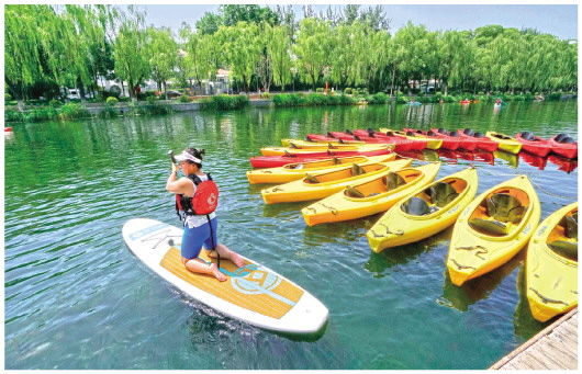 7月5日,市民在亮马河上参加水上运动。北京市朝阳区对辖区内的亮马河从改建驳岸、绿化美化、照明亮化、水体治理、动植物保护等方面进行全面景观和环境提升,串联起“1河2湖24桥18景”。同时,朝阳区还建立河湖长制、每日专人巡查制,采取物业专业管理、社会居民共治等一系列措施。18公里的滨水绿道全线贯通,游人可以在亮马河两岸跑步、散步,还可以乘船游览,参加皮划艇、桨板等体育运动。亮马河成为一条城市中的“亲民河”。 新华社记者李欣摄