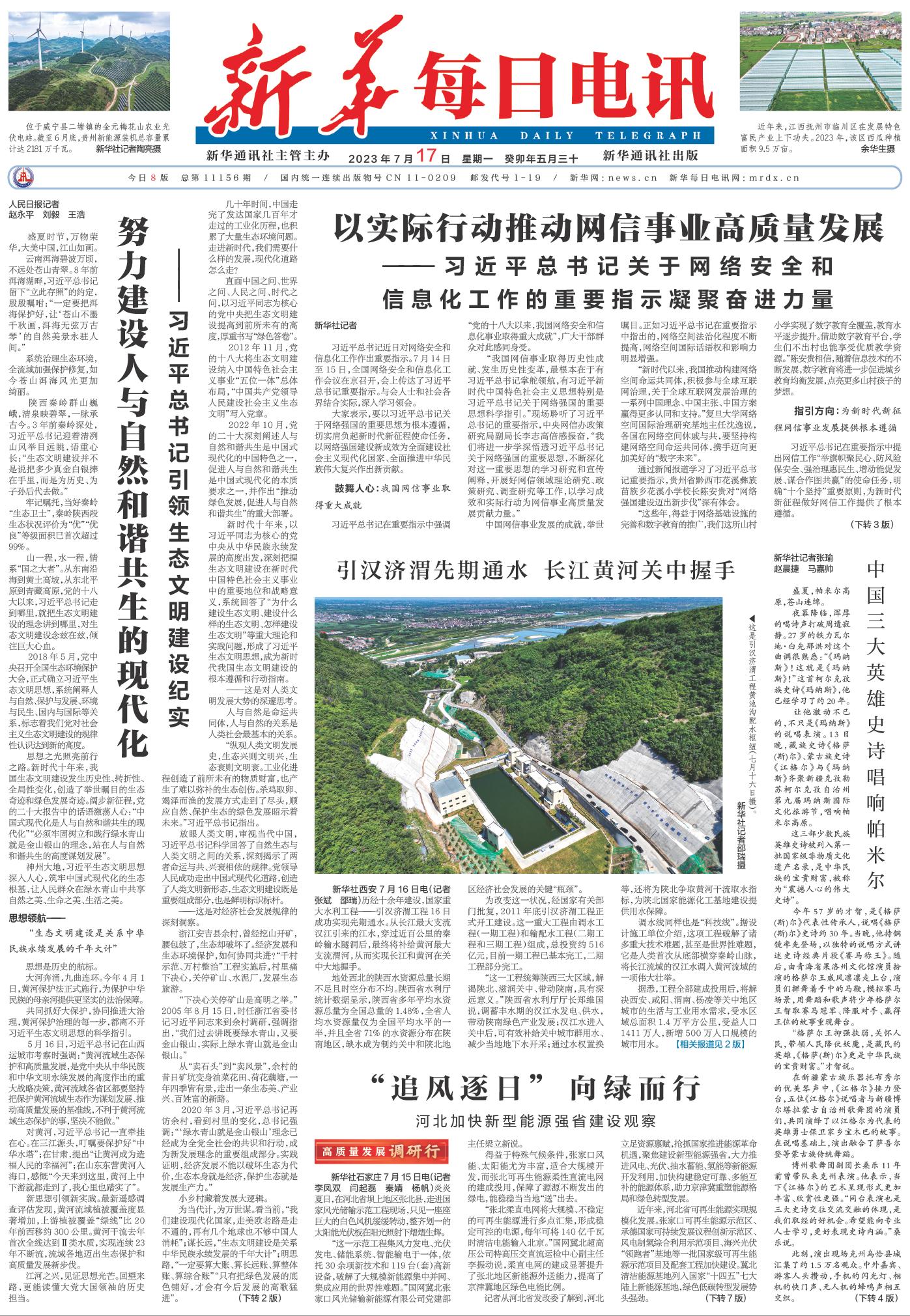 新思想引领新实践。最新遥感调查评估发现,黄河流域植被覆盖度显著增加,上游植被覆盖“绿线”比20年前西移约300公里。黄河干流去年首次全线达到Ⅱ类水质,实现连续23年不断流,流域各地迈出生态保护和高质量发展新步伐。