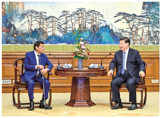 习近平指出,你担任菲律宾总统期间,本着对人民负责、对历史负责的态度,毅然作出改善对华关系的战略选择,中菲关系得以重回正轨并蓬勃发展,为两国友好交往作出重要贡献。中菲同为亚洲发展中国家,两国发展根植于睦邻友好的周边环境,根植于合作共赢的亚洲大家庭。中国奉行亲诚惠容的周边外交理念,一向坚持与邻为善、以邻为伴。中方始终重视中菲关系,愿同菲方一道,推动中菲关系行稳致远。希望你继续为两国友好合作发挥重要作用。