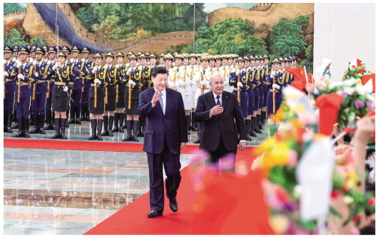 习近平指出,今年是中阿建交65周年。65年前,反对帝国主义和殖民主义、争取民族独立解放的共同事业使我们两国走到一起。65年来,中国和阿尔及利亚始终患难与共、守望相助,相互理解、相互支持,是追求共同发展和民族振兴道路上的真诚朋友、天然伙伴。中方正在以中国式现代化全面推进中华民族伟大复兴,阿方正在着力推进建设“新阿尔及利亚”。中方愿同阿方一道努力,发扬光大传统友谊,推动中阿全面战略伙伴关系取得更大发展。