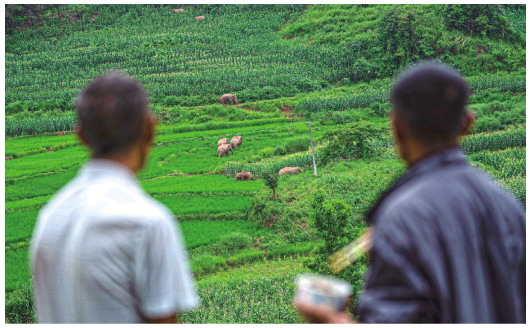 7月19日,村民一边吃饭一边遥望象群。新华社记者费茂华摄