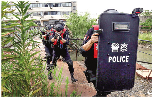 8月11日,特警队员从码头上向躲藏在货船上的“嫌疑人”发起攻击。当日,上海闵行公安分局特警支队联合水上治安派出所在黄浦江开展夏季实战综合演练,在锻炼特警快速处置突发事件能力的同时,也全面检验夏季比武训练成果,不断锤炼特警队员的综合能力。 本报记者凡军摄