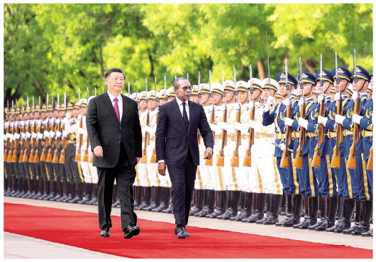 这是会谈前,习近平在人民大会堂东门外广场为塔隆举行欢迎仪式。 新华社记者翟健岚摄