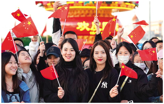 十月一日,在观看升旗仪式后,人们在北京天安门广场留影。 新华社记者张晨霖摄 |