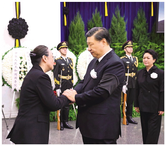 上午9时许,习近平和夫人彭丽媛,李强、赵乐际、王沪宁、蔡奇、丁薛祥、李希、韩正等,在哀乐声中缓步来到李克强同志的遗体前肃立默哀,向李克强同志的遗体三鞠躬,并与李克强同志亲属一一握手,表示慰问。胡锦涛送花圈,对李克强同志逝世表示哀悼。