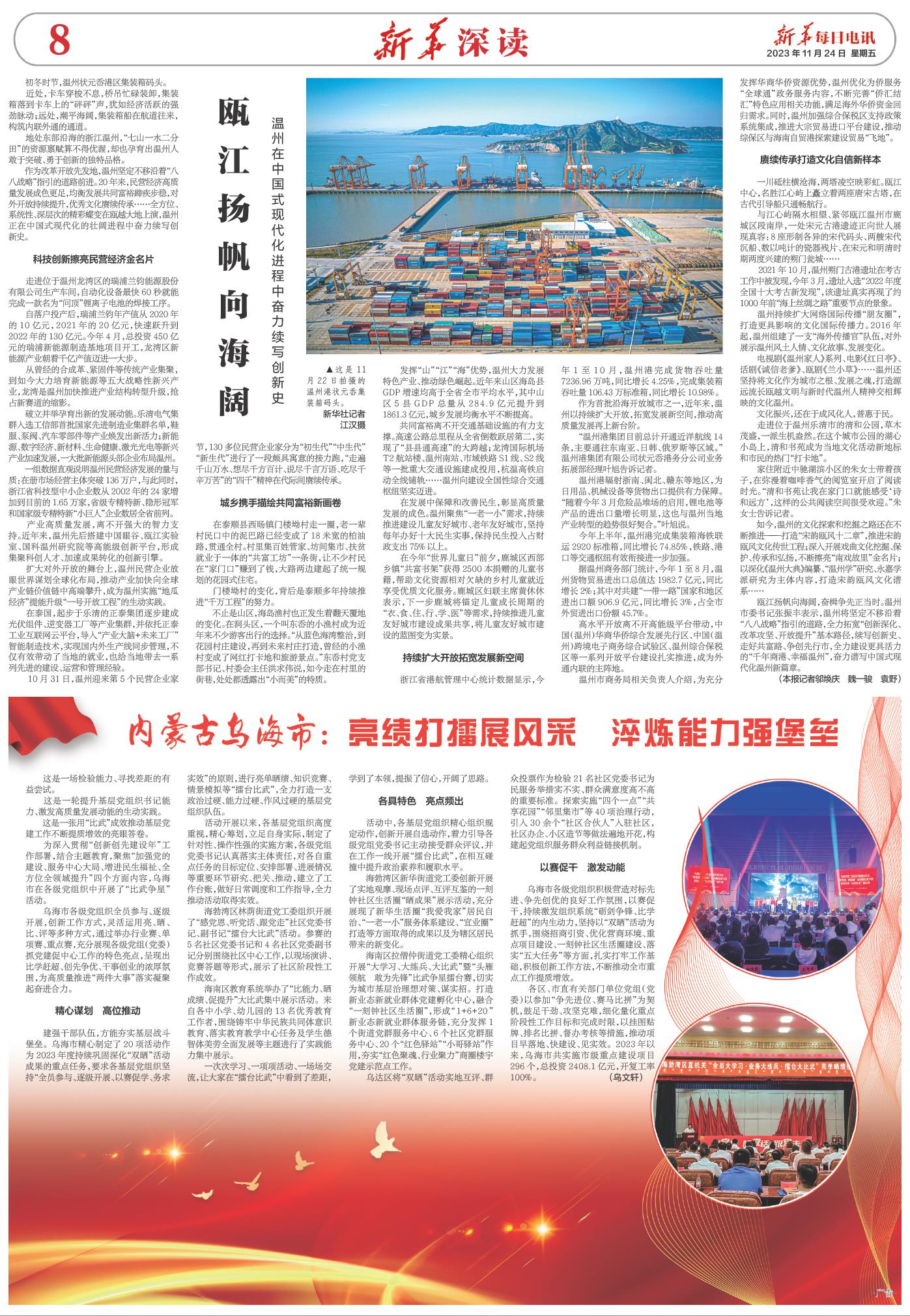 作为改革开放先发地,温州坚定不移沿着“八八战略”指引的道路前进。20年来,民营经济高质量发展成色更足,均衡发展共同富裕蹄疾步稳,对外开放持续提升,优秀文化赓续传承……全方位、系统性、深层次的精彩蝶变在瓯越大地上演,温州正在中国式现代化的壮阔进程中奋力续写创新史。