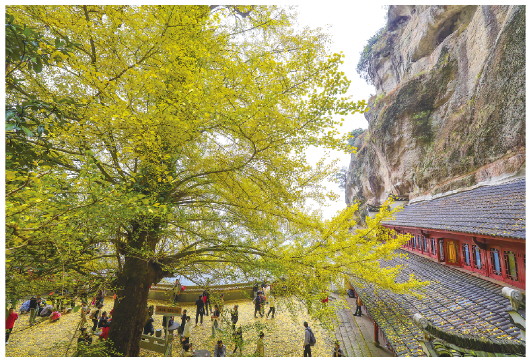 初冬时节,浙江省建德市大慈岩悬空寺前的古银杏树披上“黄金甲”,漫天飞舞的银杏“雨”,构成一幅绝美的图景,成为当地乡村旅游的网红打卡地。这棵古银杏树树高39.5米,胸径1.3米,曾入选“杭州十大最美古树名木”,树龄已有700多年,是建德的银杏之王。