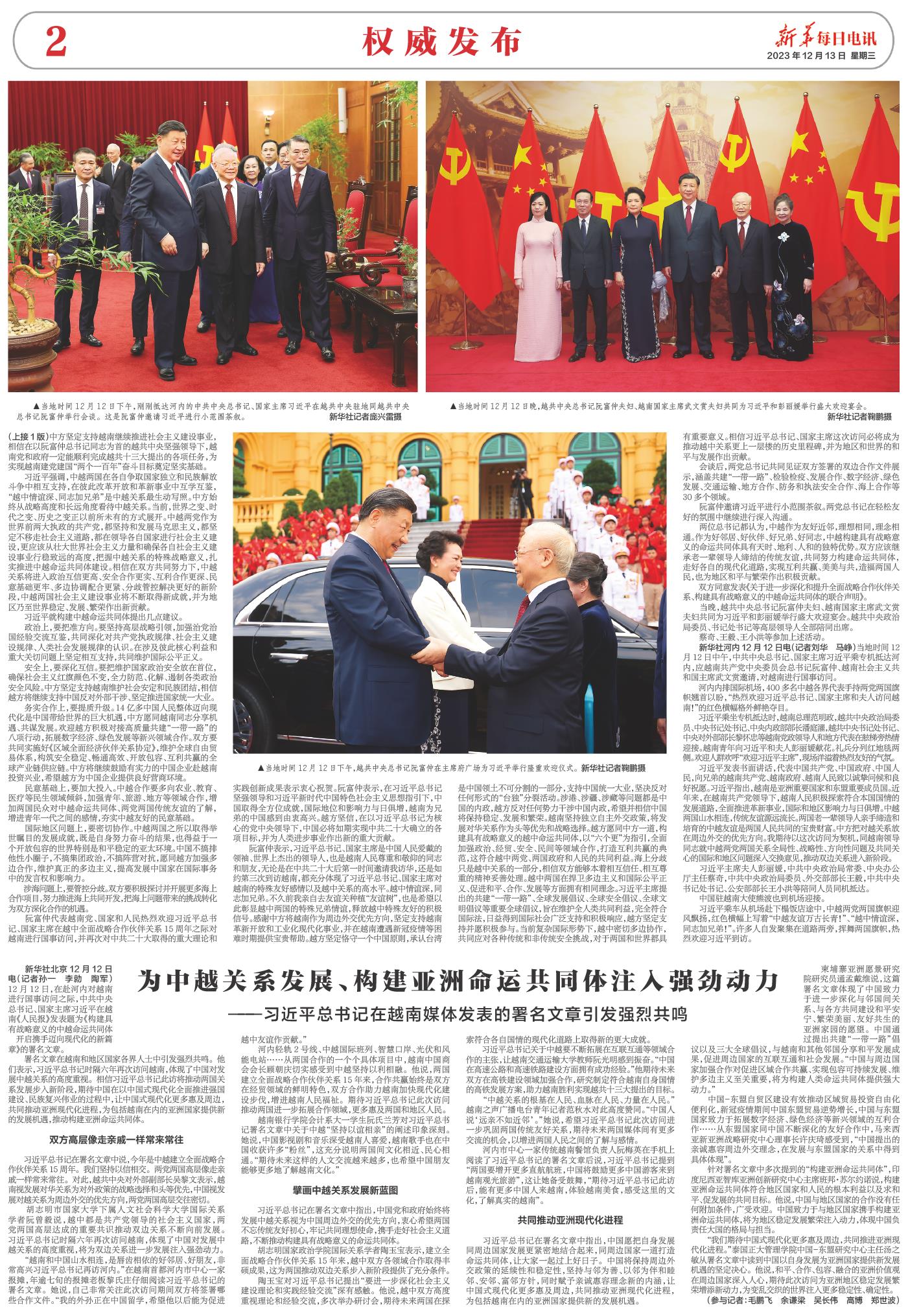 新华社北京12月12日电(记者孙一 李勍 陶军)12月12日,在赴河内对越南进行国事访问之际,中共中央总书记、国家主席习近平在越南《人民报》发表题为《构建具有战略意义的中越命运共同体 开启携手迈向现代化的新篇章》的署名文章。