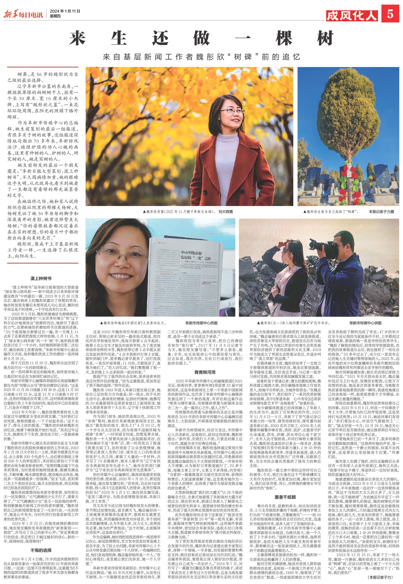 她对同事温暖如春。报社采访部记者陈力华回忆说:“2021年冬天我母亲去世,魏总编听说后马上打电话、发微信安慰我,让我万万没想到的是,她还亲自到家来看我,当她眼含热泪紧紧地抱着我的那一瞬间,我感觉她像自己的亲姐姐一样,很想很想那个才华横溢、永远充满正能量的魏姐。”