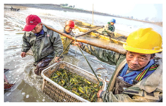 湖南省益阳市武圣宫镇千亩渔场喜获丰收。1月13日,渔民在武圣宫镇沿河堤村搬运捕捞的黄颡鱼。新华社记者陈思汗摄