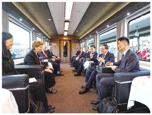 ▲当地时间1月14日下午,国务院总理李强与瑞士联邦主席阿姆赫德共同乘专列自苏黎世前往瑞士首都伯尔尼,一路在轻松友好的氛围中坦诚交流。新华社记者王晔摄 |