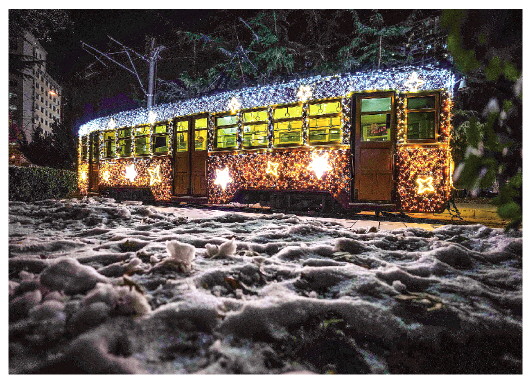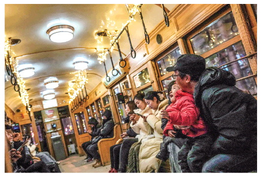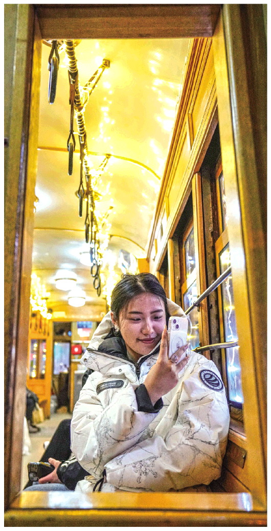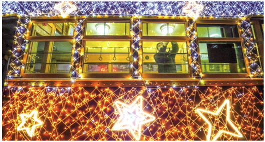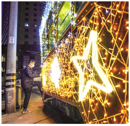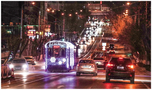 元旦前,为了更好服务游客,大连策划了一系列活动,其中一项就是打造“光影列车”。2023年12月31日晚,6辆201路“光影列车”正式发车,李鹏作为司机见证了当晚的热闹和喜庆。