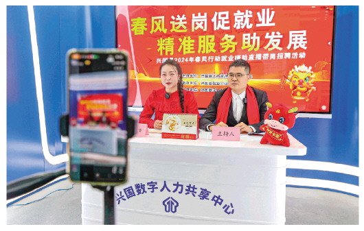 ▲2月5日,在江西省赣州市兴国县数字人力共享中心,工作人员利用网络平台进行直播带岗。春节期间,多地开展迎春招聘送岗位活动,为城乡居民节后就业提供帮助。 新华社发(陈鹏摄)